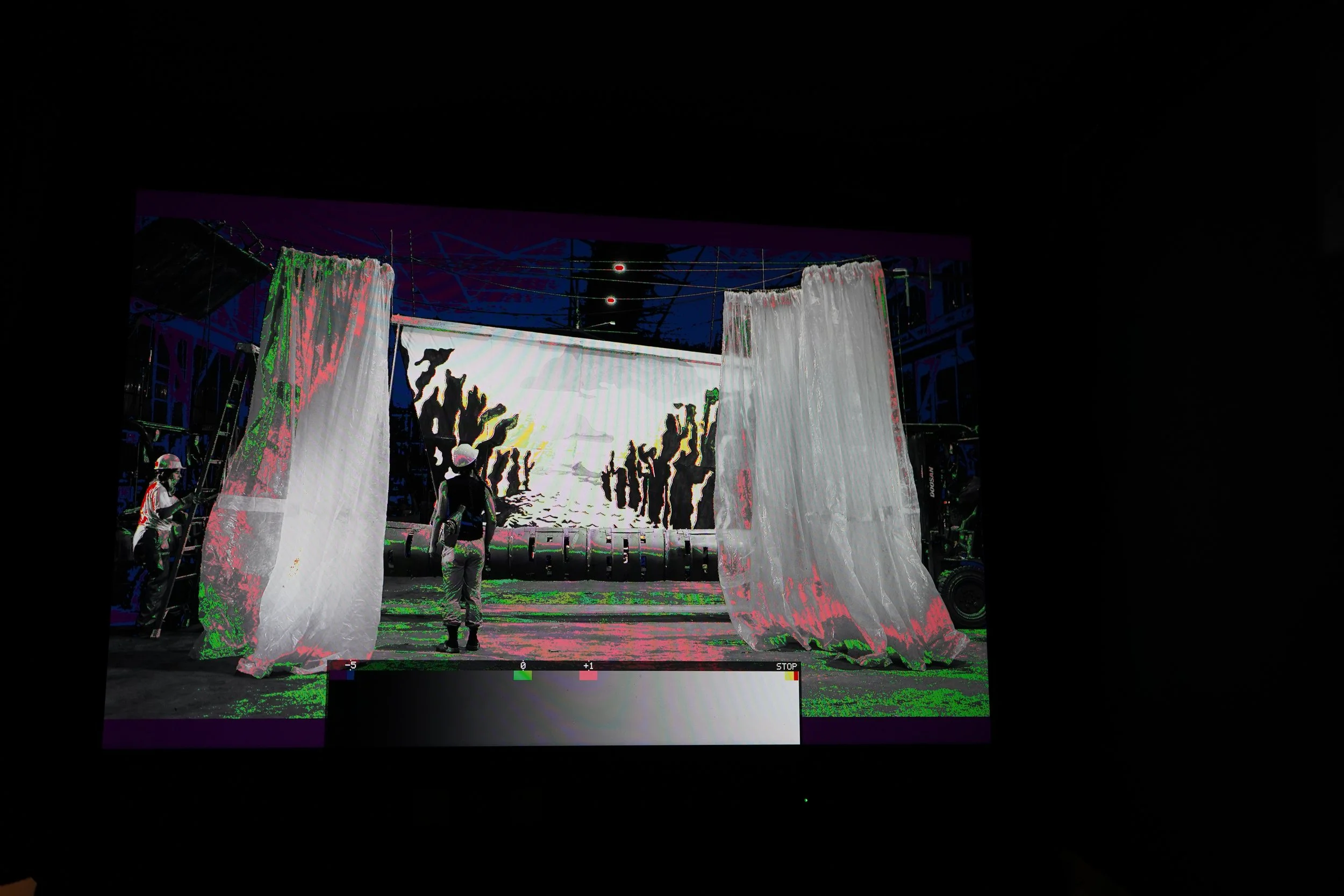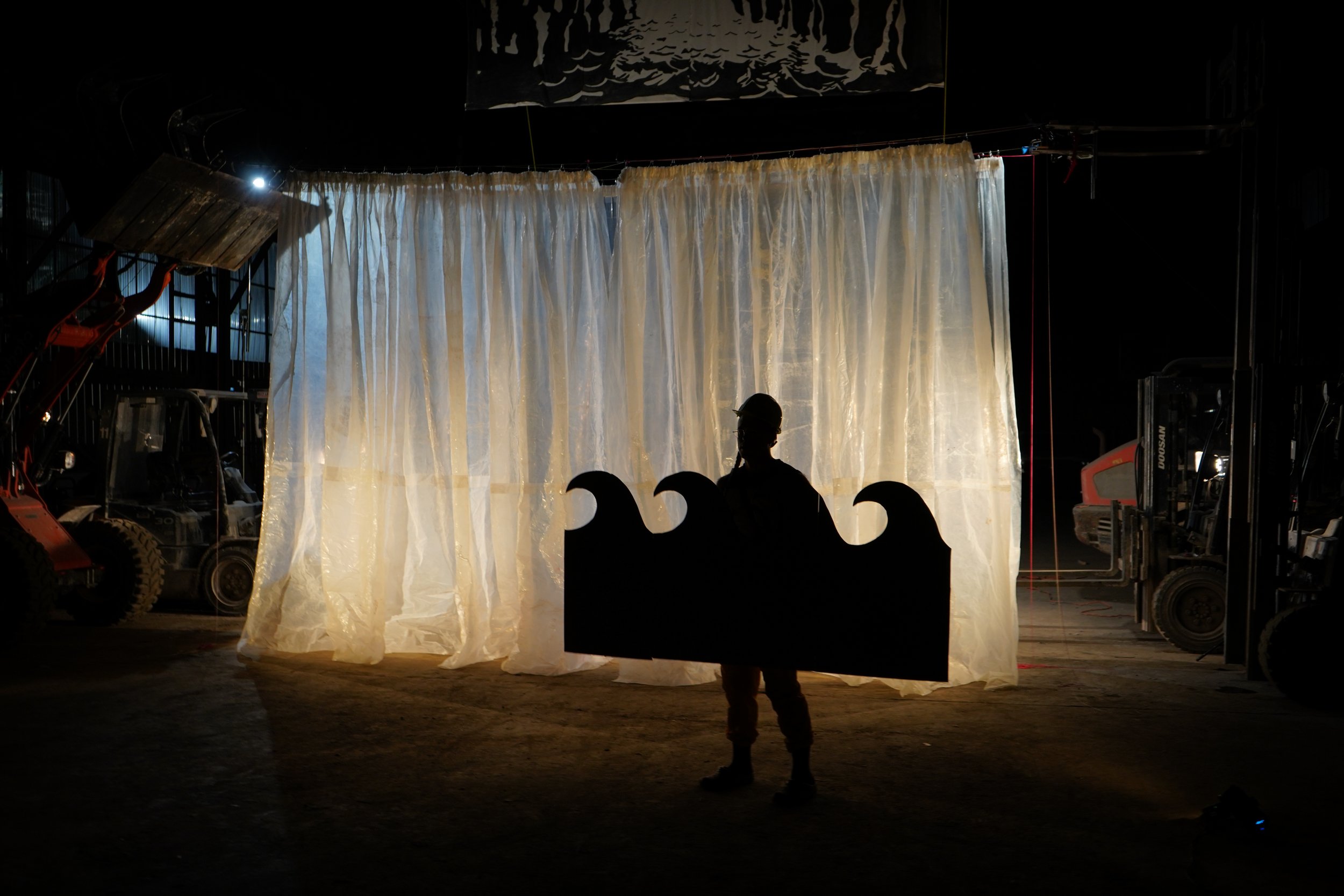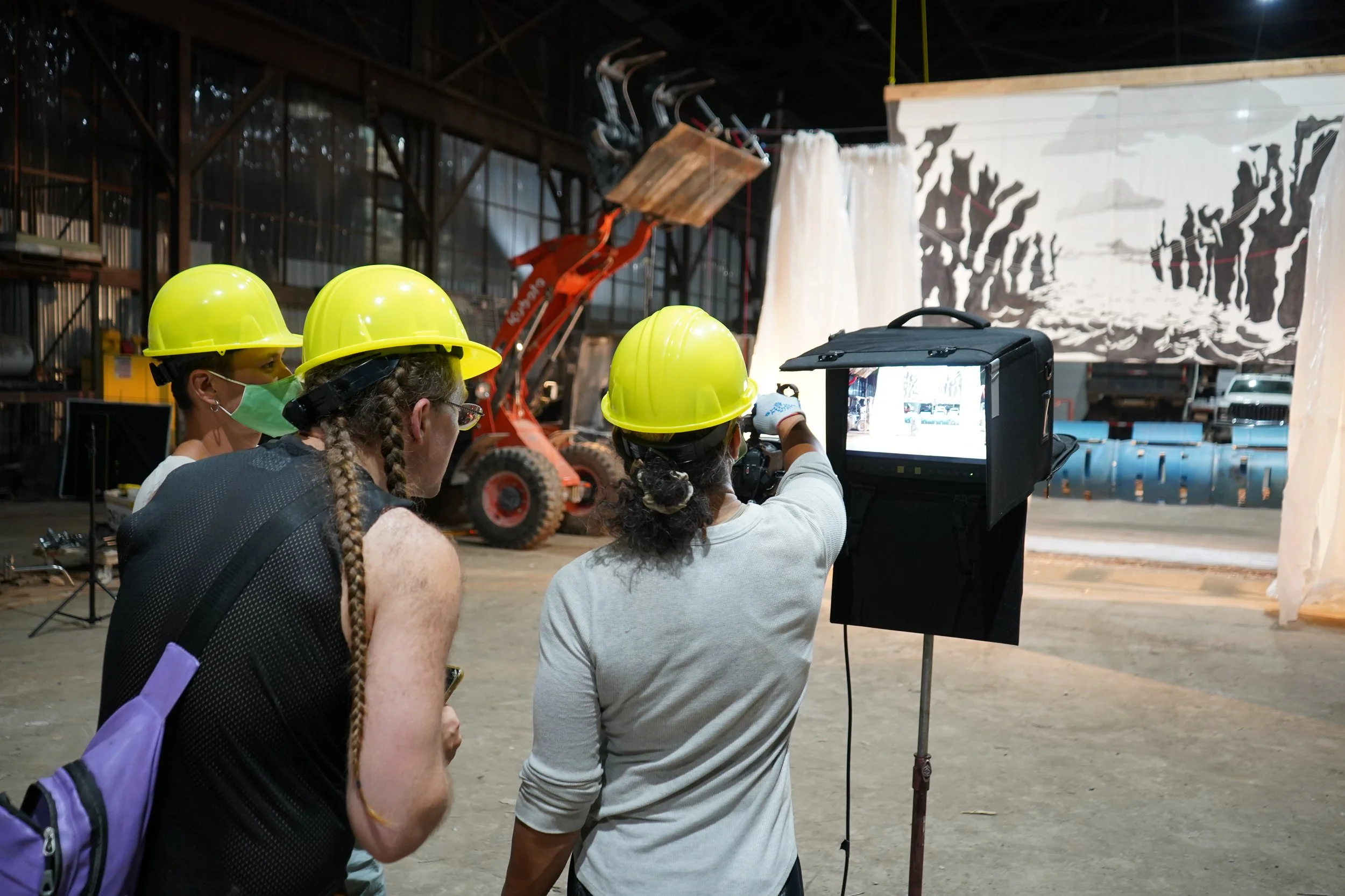 During Emmanuela Soria Ruiz’s time at RAIR, she created a video using salvaged materials to construct shifting theatrical-inspired sets (also called a scenographic transformation), which represent the changes in weather in the dumpster yard. Her sets include rippling construction plastic strip curtains and a stage apparatus representing the afterlife of materials and anxiety about the environment. Her snow machine, filled with wood chips, simulated snowfall as it rotated.