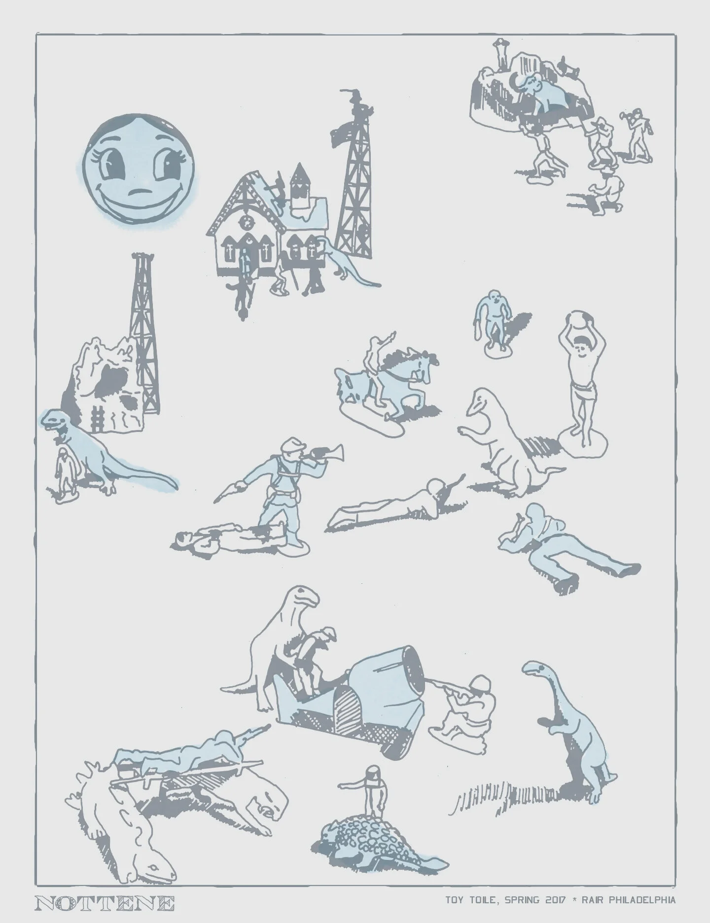 Kimberly Ellen Hall & Justin Hardison are a husband and wife team who run a print and pattern studio in Philadelphia. Our studio is called Nottene, pronounced [nuh-ten-uh]. We produce our own collection of hand-drawn and screen printed wallpaper. Our studio work comes from a practice of storytelling through drawing, and we like to push the boundaries of what is possible in screen printing to see how much of the details and pleasant imperfections can be brought out during the process. Our newest collection, launching next month at Architecture Digest Design Show, that came about through the artist residency that Kim did at RAIR is inspired by the lives we found sifting through the things people throw away. It is designed to reflect early wallpapers, called domino papers, that were small repeatable tiles hand printed on paper and used for decoration on a variety of surfaces.