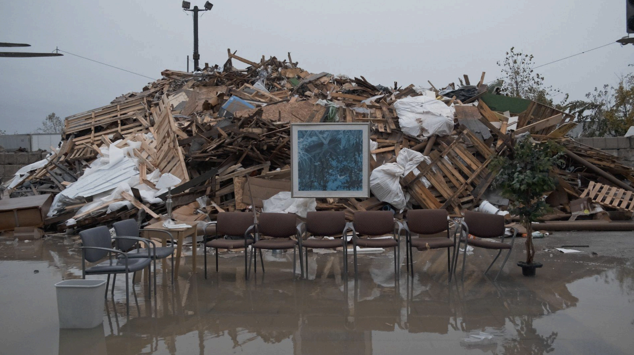 These varied objects and ephemera are all sourced from the wasteland, which in itself is a container but also a character that somehow both absorbs and also resonates its own grief. In this landscape, a fleet of 1-800-GOT-JUNK trucks comes and goes, like clockwork, disposing of broken promises and shared delusions. In one scene, a gray corporate cubicle is easily demolished by the claw of an excavator, emphasizing the insignificance of that office setting––a ghost of unbridled, optimistic careerism that today feels very absurd and hopeless. In another scene, the contents of a waiting room are discarded, then reassembled in suspense, only to be destroyed again at the dump site. This action produces both heartbreak and a kind of satisfactory catharsis––evoking the many frustrations of the waiting room and what it implies––precarious healthcare, bureaucratic roadblocks, inaccessible welfare.