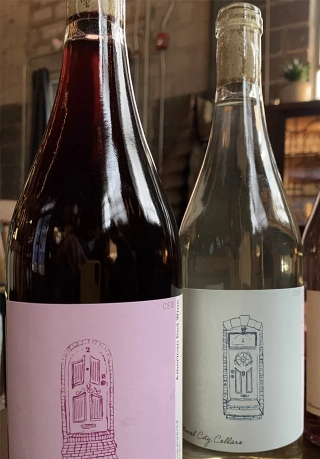 Locally produced bottles of red and white wine from Mural City Cellars and sustainably made, RAIR designed glassware made in collaboration with Tyler Glass Department